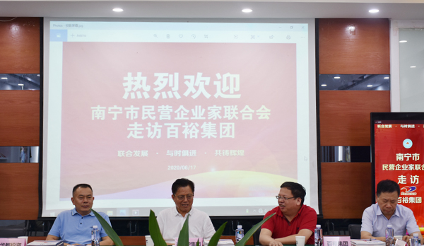 南寧市民營(yíng)企業(yè)家聯(lián)合會(huì)始建于1992年4月,是南寧市成立最早的商會(huì)之一。會(huì)員行業(yè)涵蓋房地產(chǎn)開(kāi)發(fā)、融資擔(dān)保、建材、制造、礦業(yè)、餐飲、農(nóng)業(yè)、五金機(jī)電、商貿(mào)物流等多個(gè)行業(yè),市場(chǎng)已拓展到美國(guó)、加拿大、日本、韓國(guó)、東盟各國(guó)等地。百裕集團(tuán)董事長(zhǎng)許曲煌做為聯(lián)合會(huì)執(zhí)行會(huì)長(zhǎng),認(rèn)真履行會(huì)員企業(yè)的義務(wù)和工作,積極與企業(yè)會(huì)員企業(yè)交流學(xué)習(xí)。此次走訪活動(dòng)中,各企業(yè)家參觀了百裕集團(tuán)產(chǎn)品展示廳、觀看了集團(tuán)各分公司、生產(chǎn)中心、研發(fā)中心等相關(guān)視頻短片,并在會(huì)議室進(jìn)行了交流會(huì)議。
