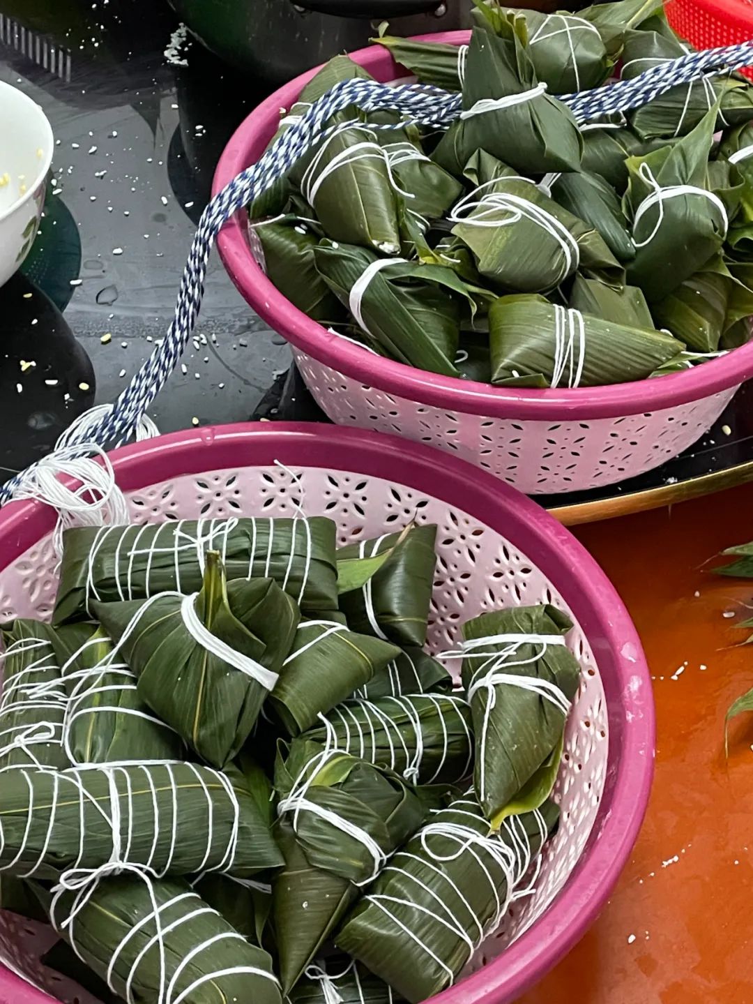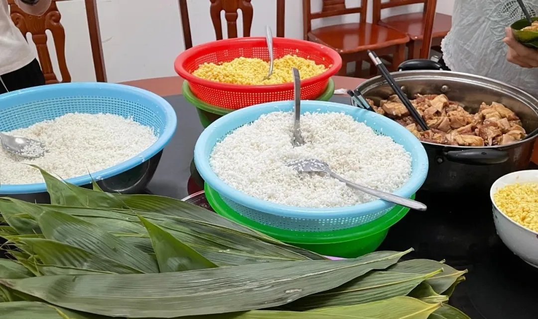 現(xiàn)場準(zhǔn)備了豐富多樣的餡料:翠綠的粽葉、飽滿的糯米和綠豆、還有肥瘦相間的豬肉、香甜的海鮮餡料、香菇等。