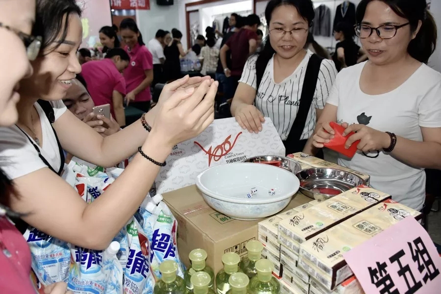 博餅的號(hào)角一經(jīng)蔡總經(jīng)理吹響,各個(gè)小組(八人圍成一桌,妥妥準(zhǔn)備就緒)果斷開(kāi)撕,場(chǎng)面十足熱鬧。一時(shí)間,骰子與碗碰撞的清脆聲、奪得大獎(jiǎng)時(shí)的歡呼聲此起彼伏。